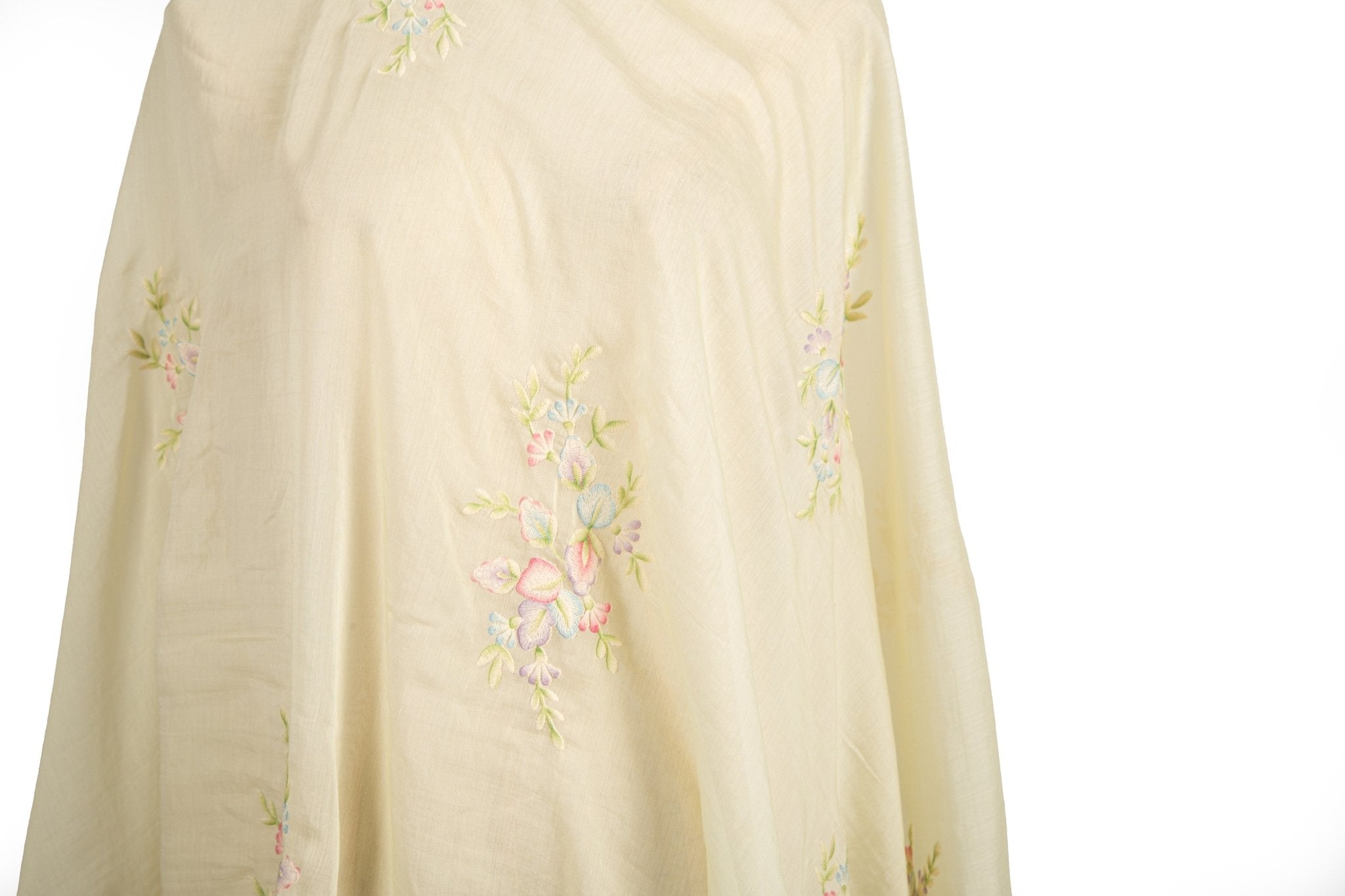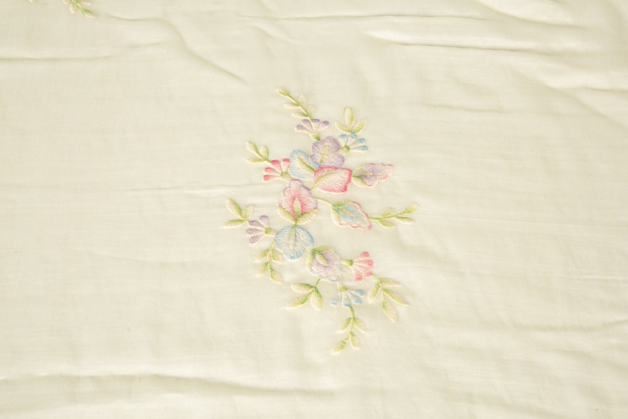 The "Idyllic Verse" fabric series is a light luxury material that pursues minimalist refinement and natural freshness. Set on a delicate, subtly luminous Cream Champagne silk sheer or organza base, the fabric is sparsely dotted with mini wildflower bouquet embroideries. The stitching is clean and fluid, executed in a low-saturation macaron color palette. This fabric emphasizes its soft drape and lustrous finish while retaining the elegance of embroidered accents. It is perfect for crafting spring/summer blouses, flowing dresses, luxury intimates overlays, or subtly romantic bridal accessories.