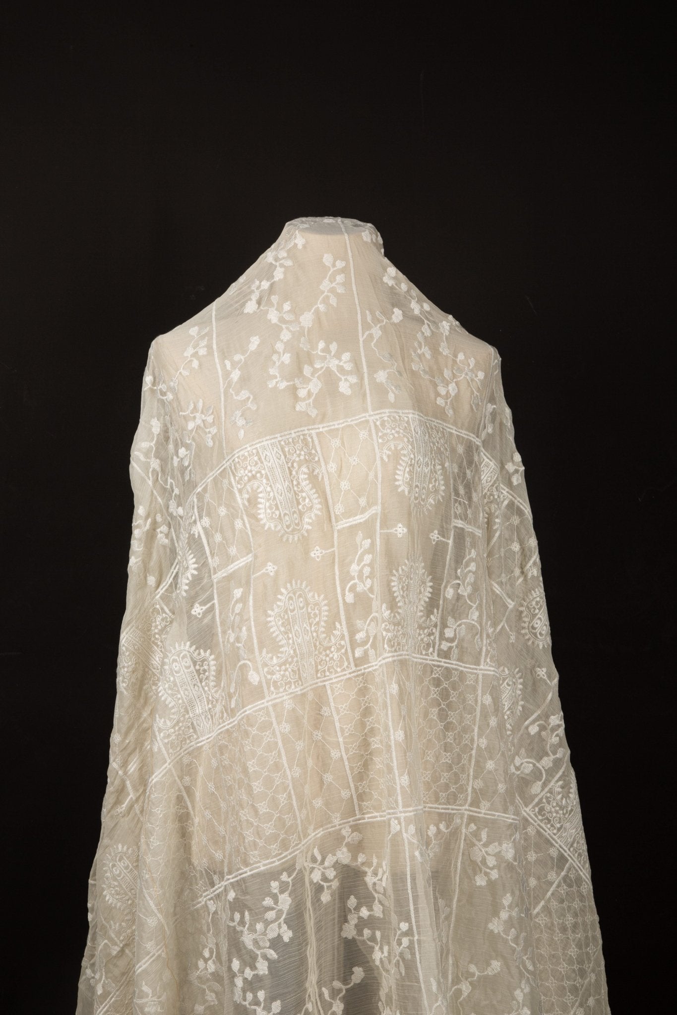 Textured Base: Crafted on a chiffon base with a subtle slub texture. This adds character and grip compared to smooth chiffon, giving it a more natural, tactile feel while remaining breathable.