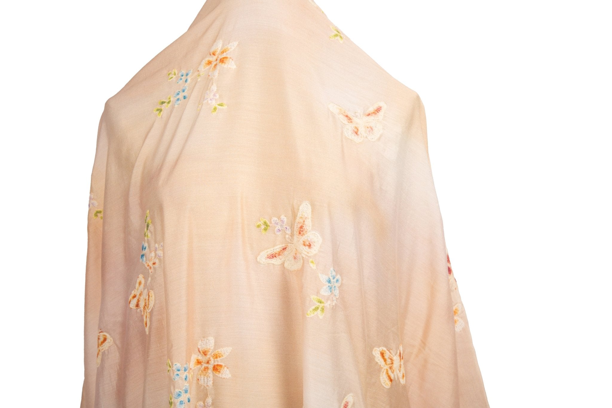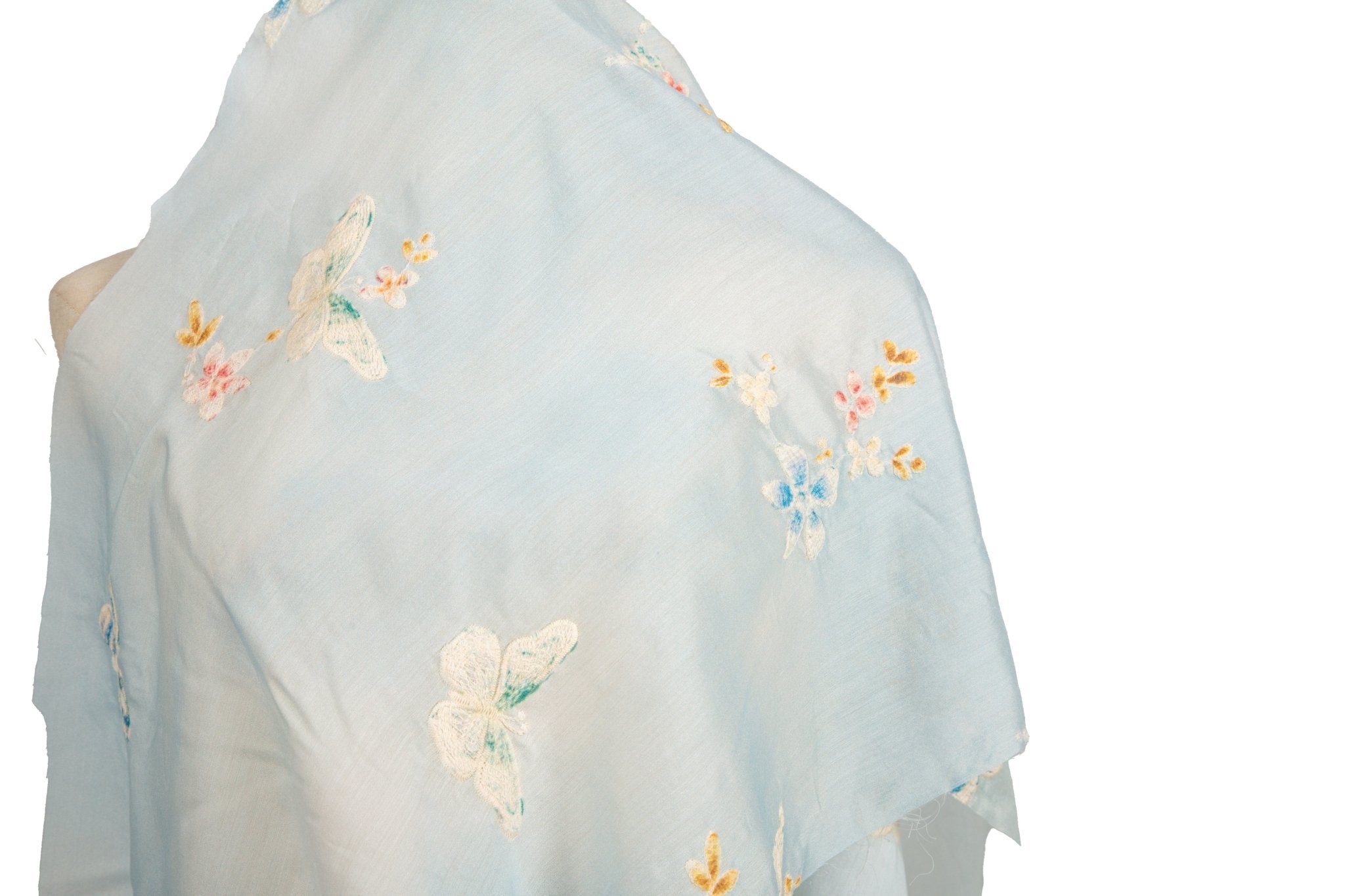 The "Butterfly Veil" fabric series is an artistic sheer material imbued with dreamy poetry. Set on an extremely light, semi-transparent soft base, it is accented with hand-painted watercolor-style butterfly and small floral motifs. The embroidery lines are sparse yet fluid, using vintage, low-saturation multi-colored threads to create a vivid image of butterflies dancing through a flower meadow. This fabric emphasizes its sheer, flowing quality and its artistic, freehand style, making it an excellent choice for romantic blouses, summer maxi dresses, light bridal overlays, or luxurious scarves.