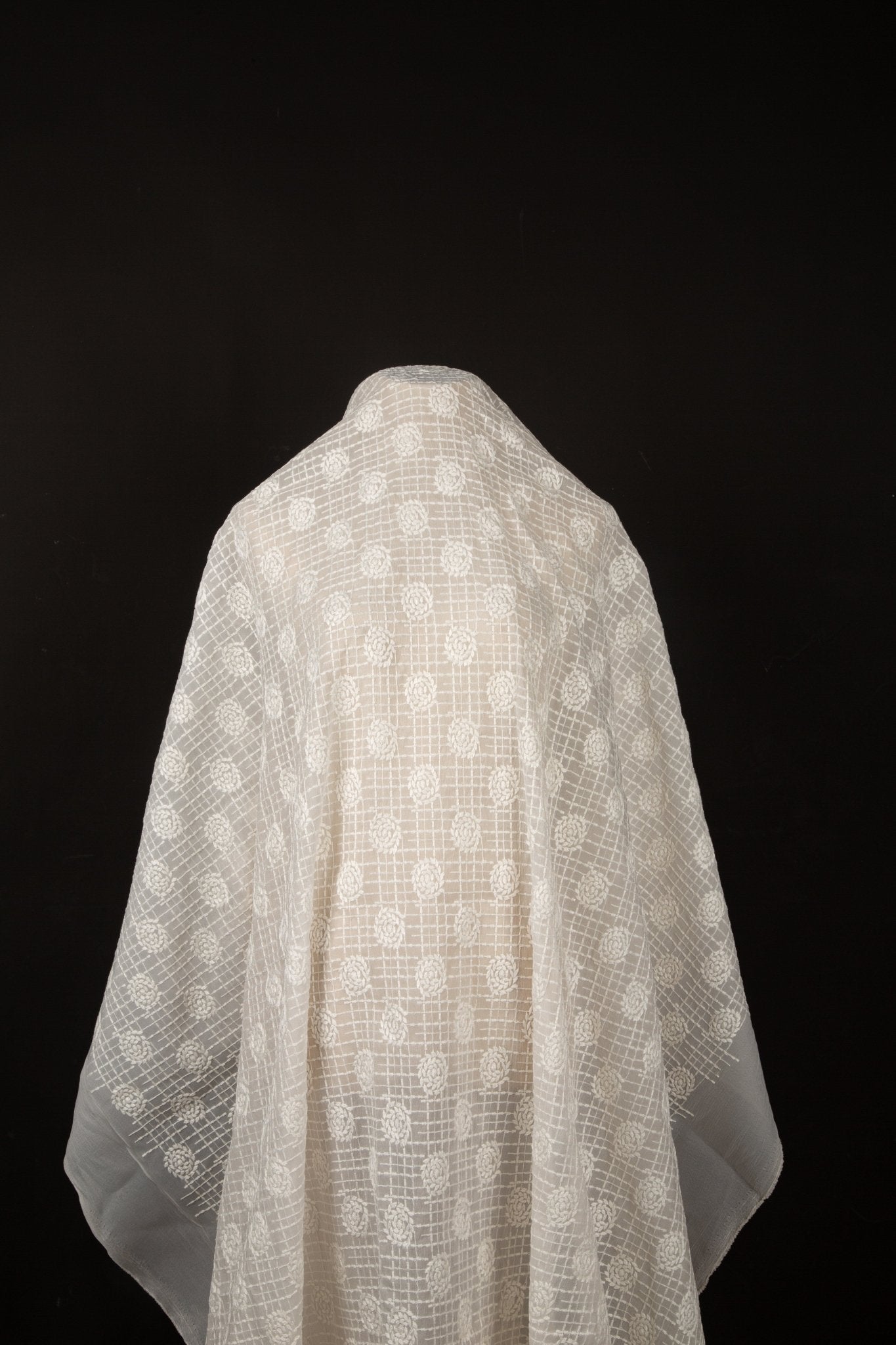 Moonlight Frost: This is the colorway featured in the image. It is a cool, crisp white with a translucent quality, resembling frost on a windowpane. The defining characteristic of this shade is its "Clean Structure" and "Tone-on-Tone Depth." The interplay of the white grid lines and the raised white floral dots against the sheer background creates a sophisticated, monochromatic texture. It is incredibly versatile: professional enough for a crisp button-down shirt, yet ethereal enough for a romantic summer dress. It acts as a natural light reflector, brightening the complexion while maintaining a look of high-end minimalism.